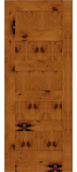 Knotty Alder is the signature wood for rustic, Southwestern, and Mountain-style interiors. Its characteristic knots, pin holes, and mineral streaks are not defects but features — each door panel is a one-of-a-kind creation with natural patterns that no manufacturing process can replicate. The wood's soft, warm tone ranges from light honey to reddish-brown, and it takes stain beautifully to achieve looks from light natural washes to deep, aged patinas. Knotty Alder is softer and more workable than oak, making it ideal for doors with detailed profiles. For homeowners creating Rustic, Lodge, Tuscan, or Southwestern interiors, Knotty Alder doors deliver an authenticity and character that defines the entire space.